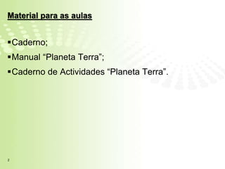 Este documento fornece informações sobre o programa de Ciências Naturais para o ano letivo de 2011/2012. Ele lista os materiais necessários para as aulas, regras de sala de aula, e o programa detalhado que inclui tópicos como a história da Terra, tectônica de placas, atividade vulcânica e estrutura interna da Terra.