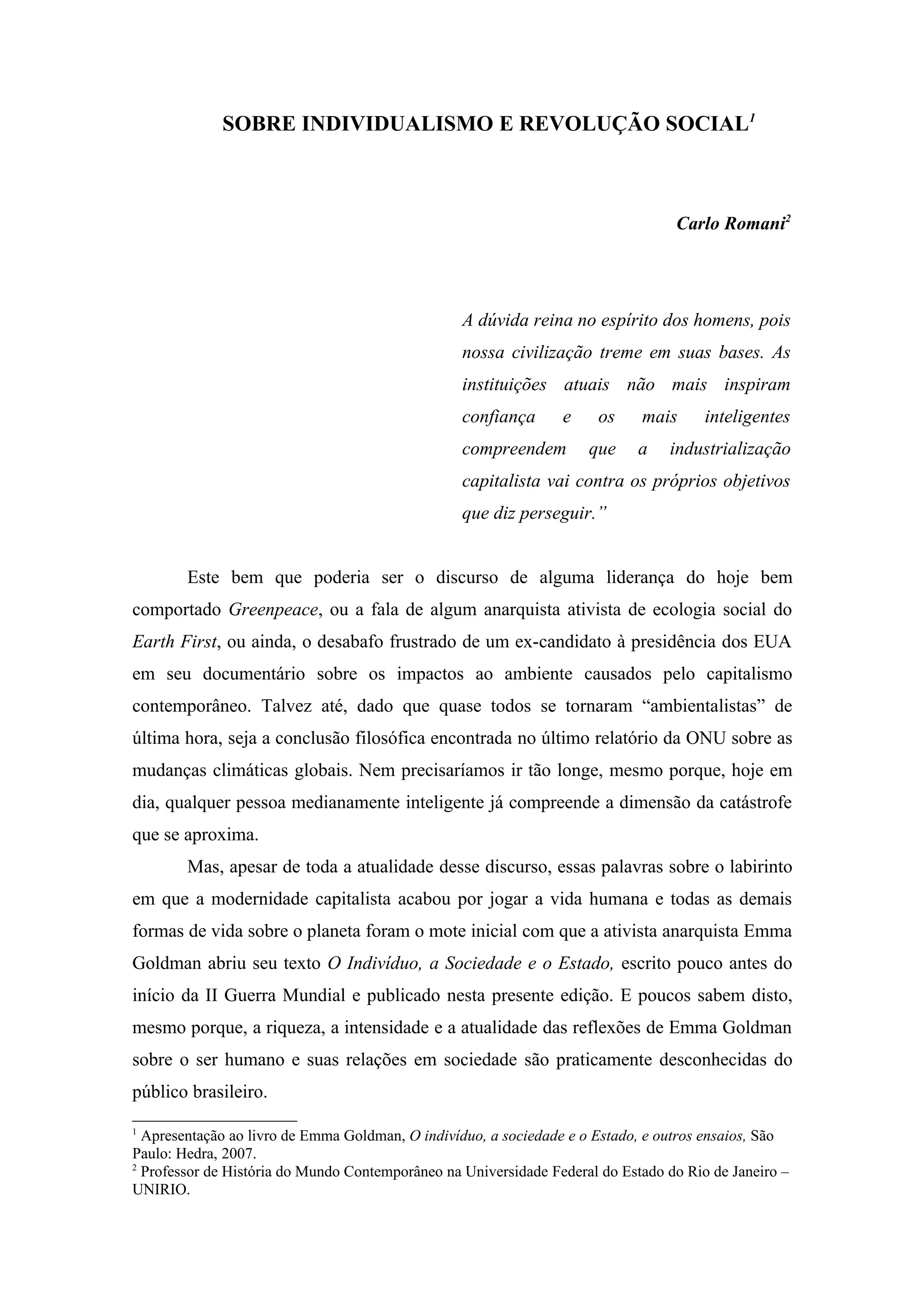 Este documento apresenta a biografia e as ideias da anarquista Emma Goldman. Detalha sua vida como operária imigrante nos EUA e sua radicalização após eventos como a greve de Haymarket. Goldman se tornou uma importante ativista anarquista e feminista, escrevendo sobre a emancipação individual e social. Suas ideias defendiam a cooperação voluntária em oposição ao Estado e ao capitalismo, e tiveram pouca repercussão no Brasil até recentemente.
