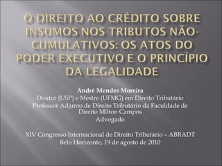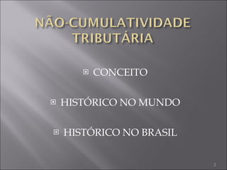 O documento discute conceitos históricos de bens para revenda e ativo imobilizado no mundo e no Brasil. Também aborda as classificações de matérias-primas, insumos, produtos intermediários e bens de uso e consumo. Por fim, menciona decisão do STJ que permite o creditamento de insumos consumidos na atividade-fim da empresa, ainda que não integrem o produto final.