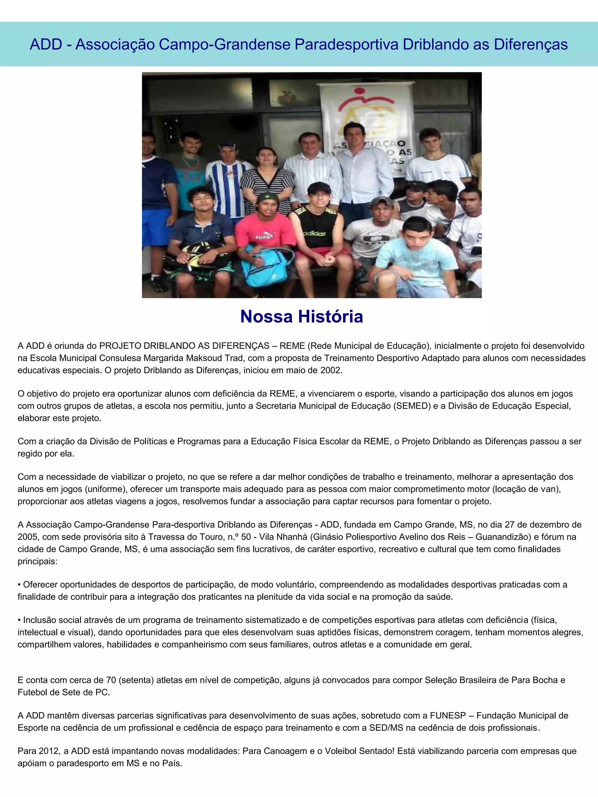 A ADD é uma associação sem fins lucrativos fundada em 2005 em Campo Grande, MS para promover a inclusão social através do esporte para pessoas com deficiência. A associação oferece treinamento e competições esportivas em modalidades como futebol, bocha e canoagem para mais de 70 atletas.