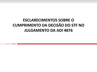 (1) O documento fornece esclarecimentos sobre como o Estado de Minas Gerais deve cumprir a decisão do Supremo Tribunal Federal no julgamento da ADI 4876, que declarou inconstitucionais alguns dispositivos da Lei Complementar 100/2007. (2) Determina um prazo de 12 meses para a realização de novos concursos públicos e nomeações de novos servidores, assegurando a continuidade dos serviços públicos. (3) Estabelece diretrizes sobre remuneração, direitos, benefícios previdenciários e