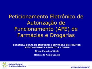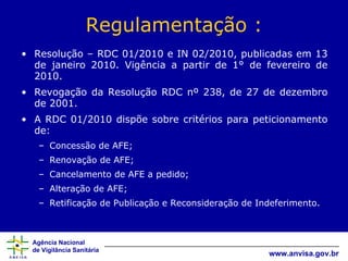 O documento descreve as novas regras para o peticionamento eletrônico de Autorização de Funcionamento (AFE) de farmácias e drogarias segundo a Resolução RDC 01/2010. O peticionamento deve ser feito preferencialmente online, enviando documentos digitalizados em JPEG ou PDF. O peticionamento eletrônico agiliza o processo e reduz custos em comparação ao envio físico. As principais etapas do peticionamento online são: login, seleção do estabelecimento, preenchimento de formulários, envio da lic