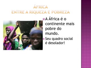 O documento discute a economia e demografia da África, destacando que: 1) A mineração e agricultura são as principais atividades econômicas, porém a África passou de exportadora para importadora de alimentos; 2) A industrialização é baixa exceto no norte e sul da África; 3) As cidades com mais de 1 milhão de habitantes estão localizadas no norte e leste do continente.