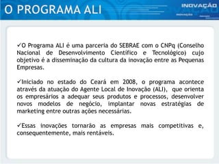 O programa ALI do SEBRAE e CNPq tem como objetivo disseminar a cultura da inovação entre pequenas empresas através de agentes locais de inovação que orientam empresários a inovarem produtos, processos e estratégias de marketing para torná-las mais competitivas e lucrativas. Iniciado no Ceará em 2008, o programa oferece atendimento gratuito, personalizado e contínuo até 2015 para empresas de diversos setores.