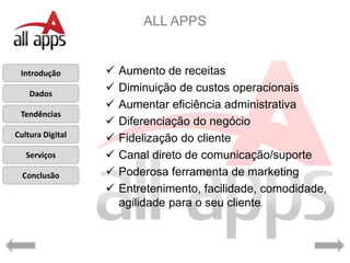 O documento discute as tendências do mercado mobile e como as empresas podem agregar valor aos seus clientes por meio de aplicativos para smartphones e tablets. Apresenta dados sobre o crescimento do uso de dispositivos móveis e do tempo gasto em aplicativos e destaca oportunidades no desenvolvimento de soluções mobile personalizadas para diferentes perfis de usuários e negócios.