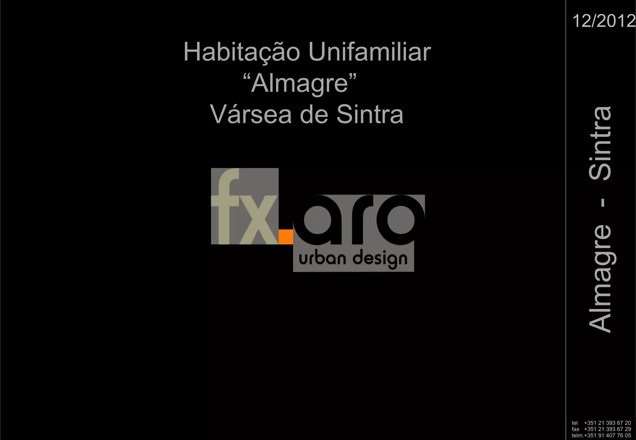 Este documento apresenta os planos e perspectivas de uma casa unifamiliar localizada em Sintra, Portugal. A casa foi projetada para satisfazer as necessidades de uma família proprietária, com ênfase na integração com o ambiente agrícola envolvente através da volumetria e materiais. A planta é retangular com distribuição dos espaços ao longo de um eixo central, maximizando a ligação com a paisagem circundante através de amplas áreas de vidro.