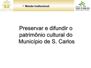 O documento descreve a evolução da estrutura administrativa e das atividades da Fundação Pró-Memória de São Carlos entre 2009 e atualmente. A Fundação preserva o patrimônio cultural do município de São Carlos e administra seu Arquivo Público e Histórico, realizando atividades educativas, de pesquisa e eventos culturais.