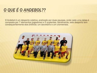 O documento descreve as regras básicas e conceitos do andebol, incluindo que é um esporte coletivo jogado por duas equipes de sete jogadores cada, com o objetivo de marcar gols através da bola passar completamente a linha da baliza adversária. As regras incluem que os jogadores podem segurar a bola por no máximo três segundos e dar três passos antes de driblar, e só podem arremessar dentro dos seis metros da baliza.