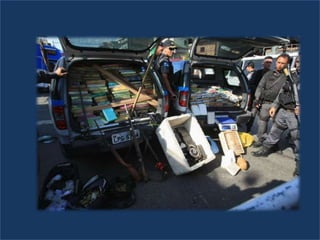 O documento fornece estatísticas e informações sobre a segurança pública no Estado do Rio de Janeiro. Apresenta dados demográficos, estratégias implementadas como UPPs, investimentos em tecnologia e aumento do efetivo policial, com resultados como queda nos índices de criminalidade.