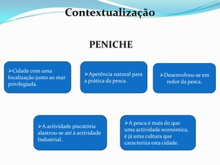 Este documento apresenta um anteprojeto sobre a influência do setor das pescas na atividade econômica do concelho de Peniche. O projeto visa (1) justificar a importância da pesca no concelho, (2) descrever a atividade piscatória em Peniche e suas instituições, e (3) analisar as indústrias de transformação de pescado e a comercialização do pescado. A metodologia inclui entrevistas, inquéritos à comunidade escolar, e pesquisa bibliográfica.