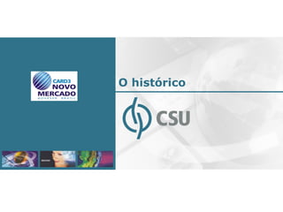 O documento discute a posição de liderança da CSU nos setores de cartões de crédito e serviços financeiros no Brasil. Apresenta dados mostrando que a CSU é a maior administradora independente de cartões de crédito do país e líder em programas de fidelização. Também destaca a diversificação da empresa para novas oportunidades de negócios nos setores de análise de crédito, prevenção à fraude e atendimento ao cliente.