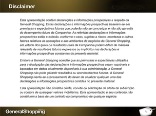 Este documento apresenta os resultados financeiros da General Shopping no 3T08 e fornece uma visão geral da empresa e do setor de shopping centers. Os principais pontos são: