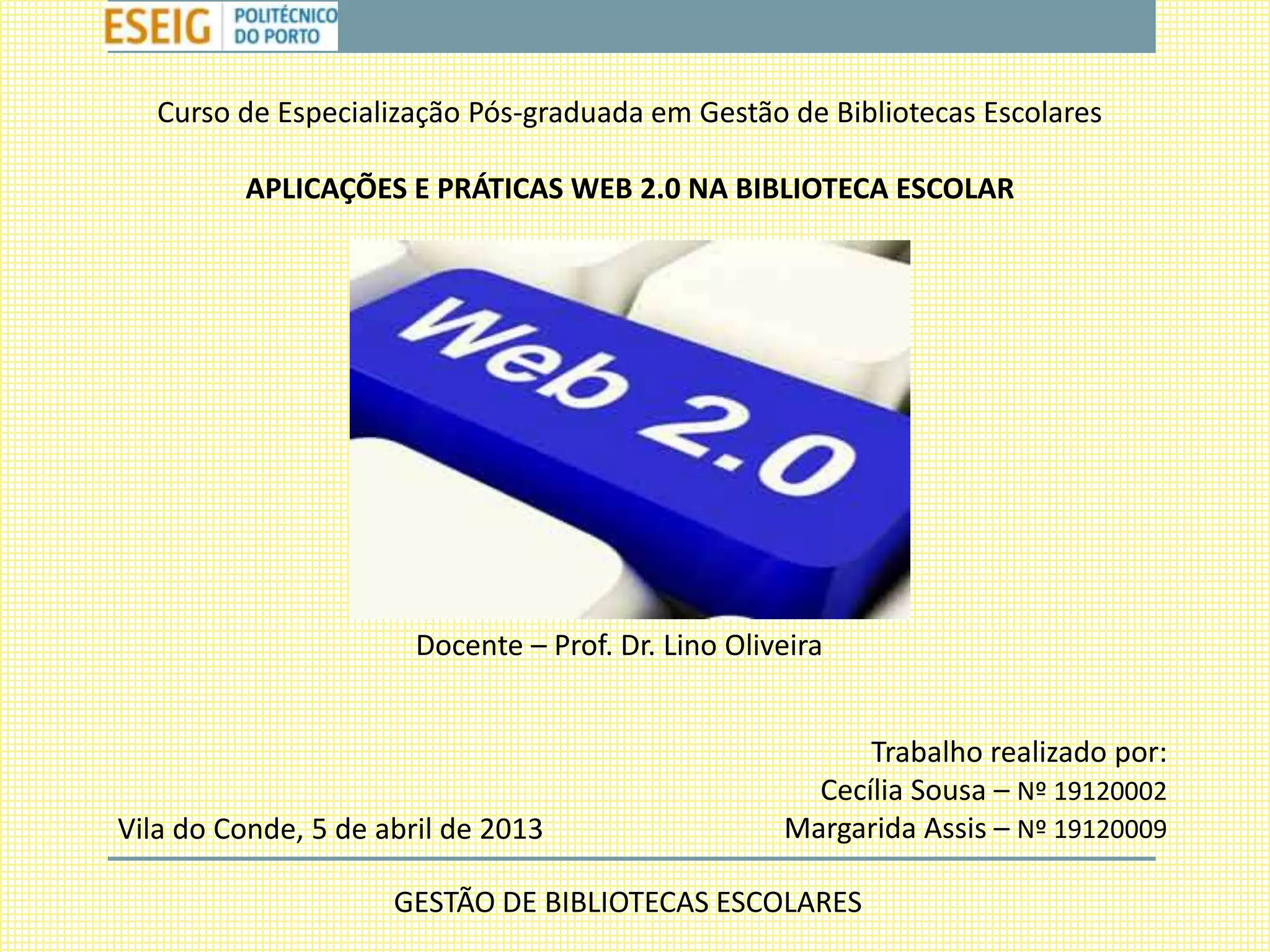 Este documento discute as aplicações e práticas da Web 2.0 em bibliotecas escolares, incluindo o uso de ferramentas como blogs. A Web 2.0 permite fácil acesso à informação e compartilhamento online, o que é essencial para aprender e ensinar. Blogs são uma boa ferramenta para bibliotecas escolares comunicarem atividades e recursos. O termo "Biblioteca 2.0" se refere à aplicação dos princípios da Web 2.0 à biblioteconomia.