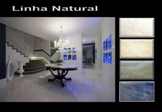 O documento descreve os produtos de pedra natural e sintética oferecidos pela Armazém Carioca, incluindo mármores, granitos, quartzo, vidro e produtos de nanotecnologia. Ele fornece detalhes sobre as propriedades e usos desses materiais para pisos e revestimentos em ambientes internos e externos.