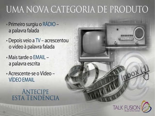 O documento descreve diversos serviços de video comunicação oferecidos pela Talk Fusion, incluindo e-mail vídeo, video conferencing e video broadcasting. Exemplos de uso incluem promoções, agradecimentos a clientes e transmissões de eventos. O conteúdo também menciona ferramentas para medição de impacto e engajamento do público-alvo.