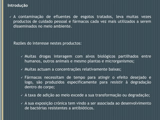 Este documento descreve um estudo que analisou a resposta de biofilmes fluviais a produtos farmacêuticos usando microarrays de DNA anônimos. Os resultados mostraram que antibióticos como eritromicina e sulfonamidas, bem como o gemfibrozil, induziram alterações na expressão gênica relacionadas a processos como produção de energia, parede celular e metabolismo lipídico. Alguns genes apresentaram respostas semelhantes em biofilmes de dois rios diferentes.