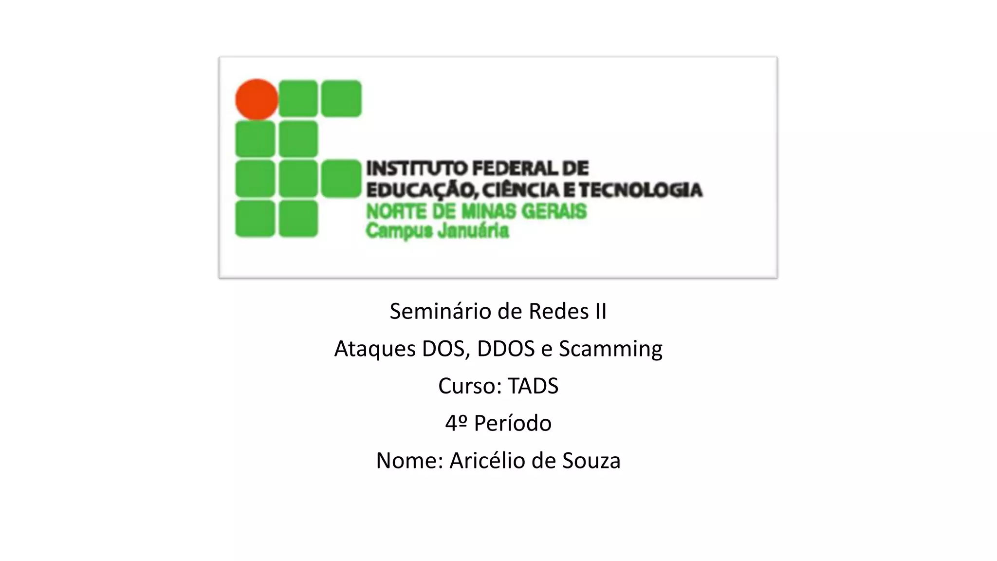 O documento discute três tipos de ataques cibernéticos: ataques DOS, ataques DDOS e ataques de scamming. Ele fornece exemplos de cada um destes ataques, explicando como funcionam e como podem ser realizados. Também apresenta algumas formas de combater ataques DDOS.