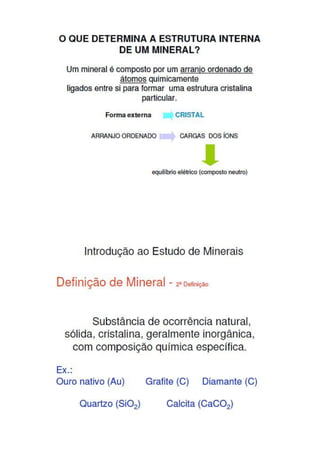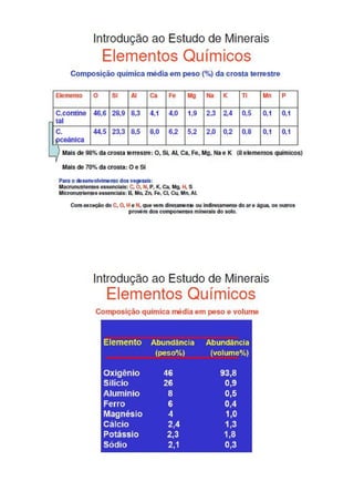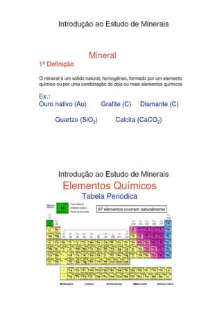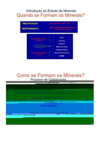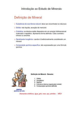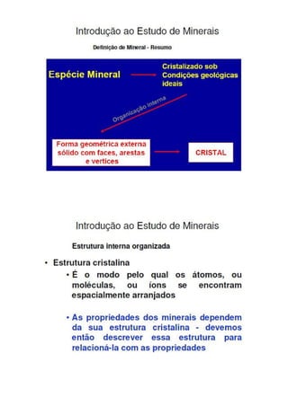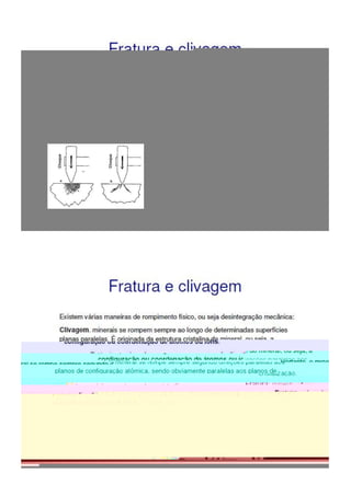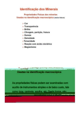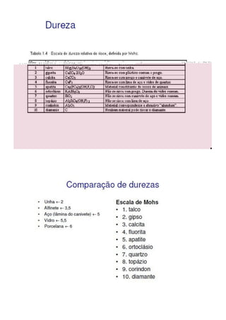 O hábito dos minerais refere-se à aparência típica que um cristal possui, incluindo características como brilho e dureza. O brilho pode ser metálico ou não metálico, enquanto a dureza é a resistência do mineral a ser riscado. A tenacidade indica como o mineral se deforma sob forças externas e pode ser testada facilmente.