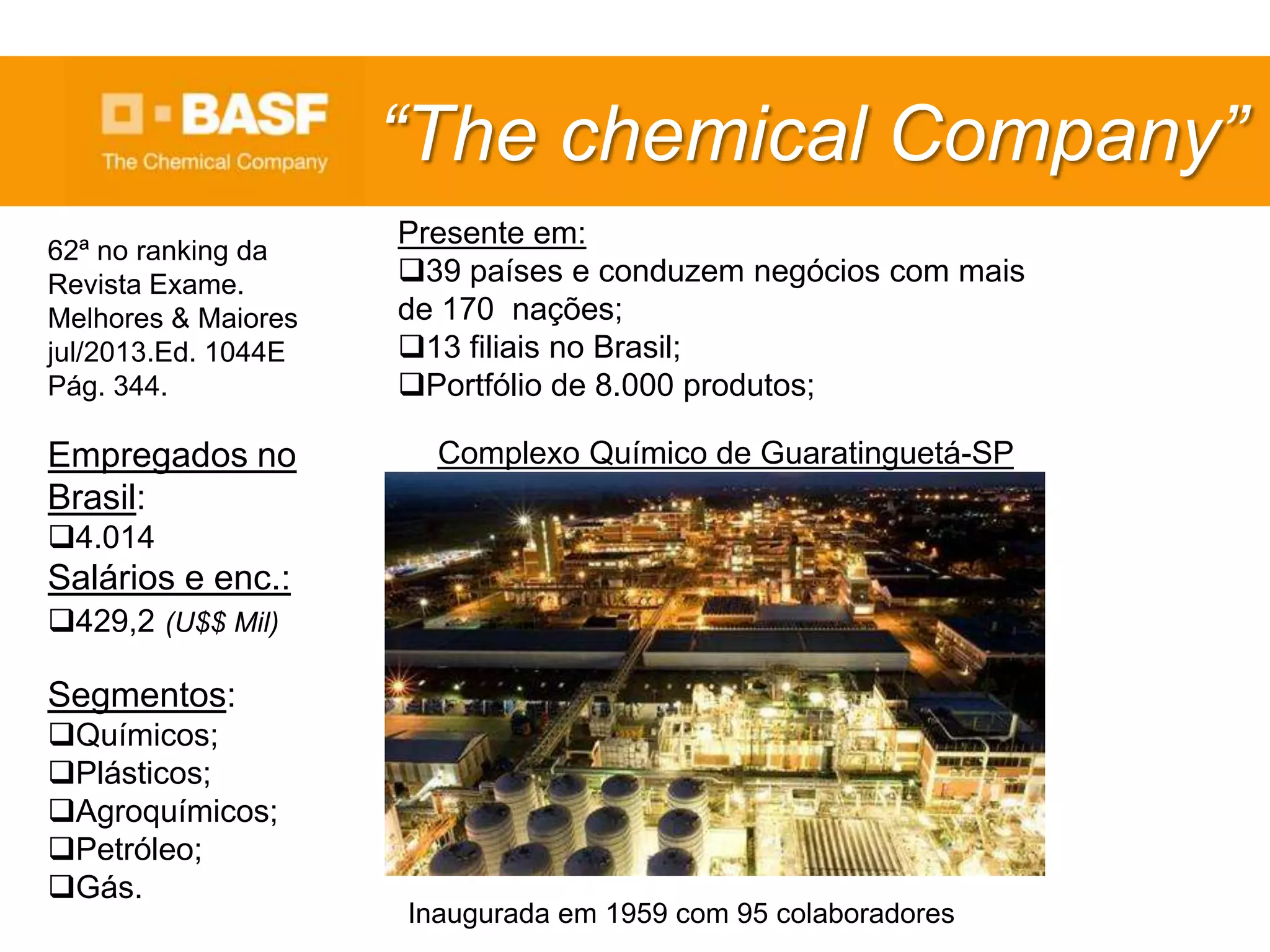 A BASF é uma empresa química alemã fundada em 1959 com 95 funcionários e atualmente é a 62a maior empresa do Brasil. A empresa opera em 39 países, possui 13 filiais e 8.000 produtos no Brasil, e teve receita de €74 bilhões em 2013 empregando 112 mil pessoas globalmente. A BASF investe em inovação, logística e sustentabilidade para clientes e fornecedores.