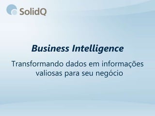 Este documento fornece um resumo da apresentação da SolidQ sobre Business Intelligence. Apresenta os principais serviços e produtos da SolidQ relacionados a BI, como Health Check, FastTrack e treinamentos. Também descreve brevemente os pilares da solução Microsoft BI, incluindo a experiência do usuário, plataforma de colaboração e infraestrutura de dados.