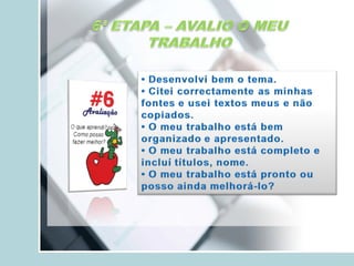 Este documento descreve as etapas de uma atividade de literacia da informação na biblioteca escolar. Os alunos irão trabalhar em grupos para pesquisar e elaborar um trabalho sobre um animal em vias de extinção, utilizando o modelo Big 6 de pesquisa e recursos da biblioteca e sites previamente selecionados.