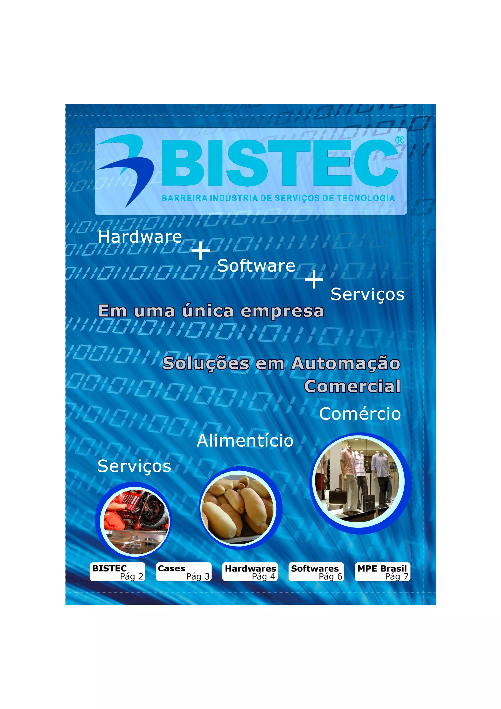 O documento descreve a empresa BISTEC, fornecedora de hardware, software e serviços de automação comercial e informática na região da Baixada Santista. A empresa apresenta sua missão, visão e valores, além de depoimentos de clientes satisfeitos com a automação comercial. O documento também descreve produtos de hardware como impressoras fiscais e balanças, softwares de gestão e controle para pequenas empresas, e detalha o prêmio MPE Brasil no qual a BISTEC foi contemplada.