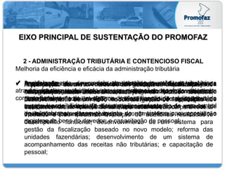 O documento descreve os principais eixos de sustentação do Promofaz, um programa para melhorar a gestão estratégica, administração tributária, finanças e recursos humanos da Secretaria da Fazenda. Os eixos incluem: 1) novo modelo de planejamento estratégico, 2) modernização da fiscalização tributária e cobrança, 3) tratamento integrado de dados financeiros e tributários e 4) atualização da infraestrutura tecnológica e gestão de recursos humanos.