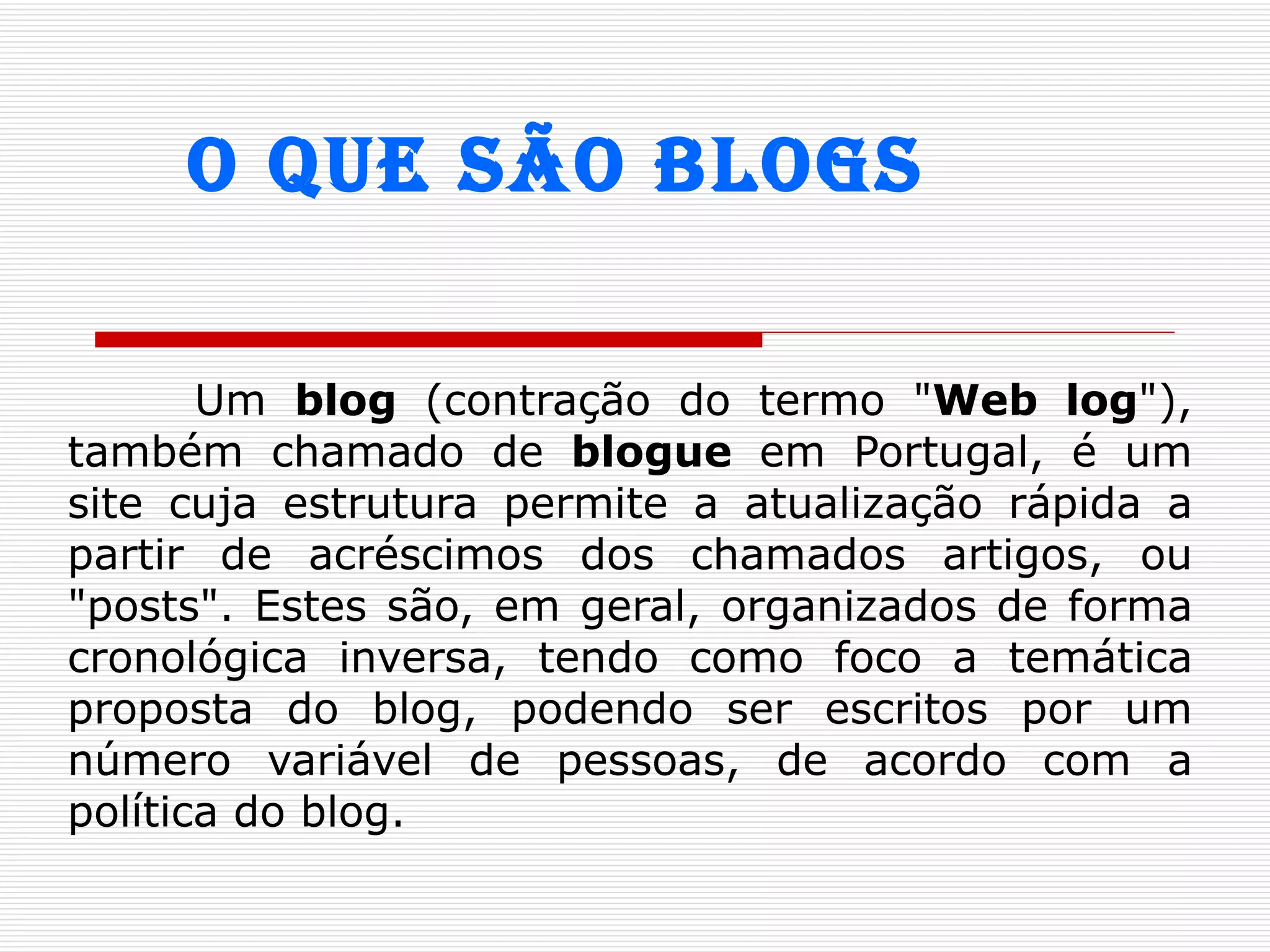 O documento descreve o que são blogs, sua evolução a partir de diários online e como as ferramentas facilitaram sua popularização. Explica também como criar uma conta no Blogger e começar a editar e configurar um blog, incluindo a adição de templates e widgets.