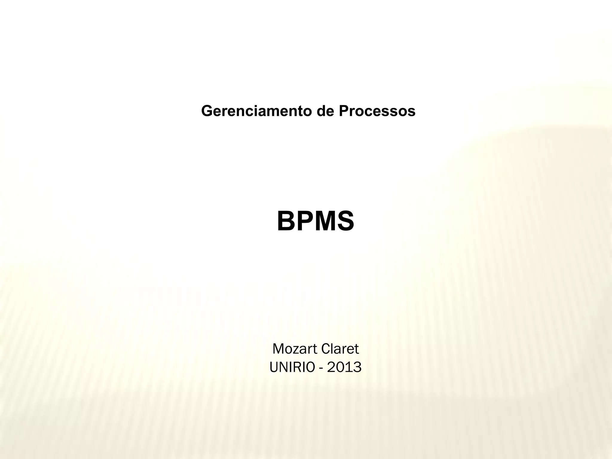 O documento discute sistemas de gerenciamento de processos de negócios (BPMS). BPMS oferecem às organizações uma plataforma para automatizar processos e apoiar a transformação corporativa. BPMS lidam com o ciclo de vida completo de um processo: modelagem, automação, execução e melhoria contínua. Alguns exemplos de BPMS incluem Bonita Soft, Bizagi e Intalio.