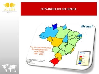 O documento descreve uma estratégia para revitalizar a igreja no Brasil chamada ALLOSmundi. A estratégia envolve: 1) restaurar os fundamentos da fé bíblica; 2) incentivar o ministério individual de cada crente; e 3) resgatar o exercício dos cinco ministérios por meio do ministério sacerdotal de todos os santos.
