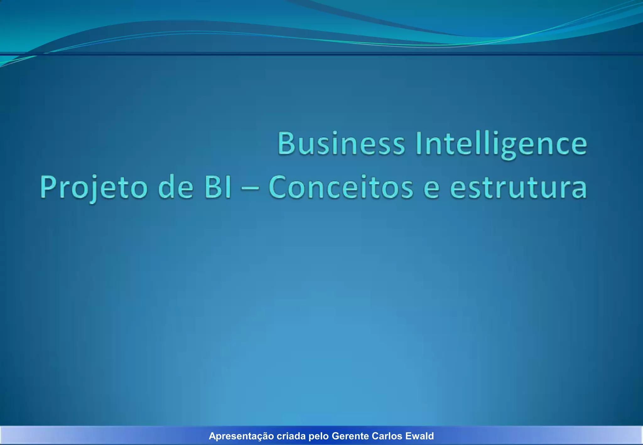 O documento apresenta os principais pontos de uma apresentação sobre Business Intelligence feita pelo Gerente Carlos Ewald. A apresentação discute conceitos básicos de BI, a importância da governança e da plataforma tecnológica, e as etapas típicas de um projeto de BI, incluindo análise, planejamento, design, testes e treinamento.