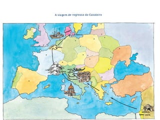 O documento descreve a estrutura narrativa de uma história, dividida em ação principal e ações secundárias. A ação principal é a viagem de ida e volta de um Cavaleiro entre a Dinamarca e a Palestina. As ações secundárias são quatro histórias intercalares sobre personagens e eventos históricos. O documento fornece detalhes sobre o enredo, personagens, tempo e espaço das diferentes narrativas.