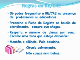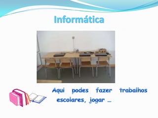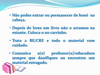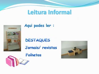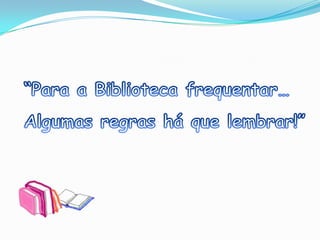 A biblioteca apresenta os serviços e recursos disponíveis, incluindo livros organizados por assunto e localização fácil através do catálogo online, com um exemplo para ilustrar como encontrar informações.