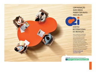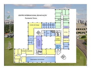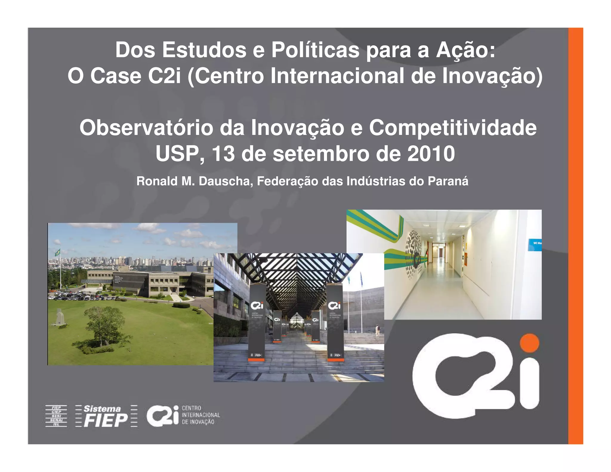 Este documento descreve o Centro Internacional de Inovação (C2i) da Federação das Indústrias do Paraná. O C2i tem como objetivo promover a inovação nas empresas paranaenses por meio de serviços de conhecimento, educação, consultoria e inteligência em inovação. O C2i é governado por um conselho administrativo e conta com diversas iniciativas como um centro de referência físico, uma rede aberta de inovação e um programa de inovação adaptado a diferentes níveis de maturidade das empresas.
