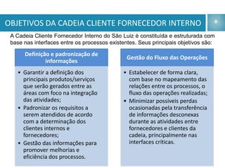 1) O documento descreve a cadeia de clientes e fornecedores internos do Hospital São Luiz, definindo seus objetivos, estrutura e fluxos.
