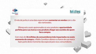 O documento fornece informações sobre o perfil do consumidor-alvo de uma campanha de marketing, incluindo: sexo feminino (56%), idade entre 25-44 anos (83%), classe social AB, escolaridade superior completa (47%). A frequência de compras é de 1 a 2 vezes por semana (36%). A campanha será exibida em 143 lojas da rede, com 5 impactos por consumidor em média.