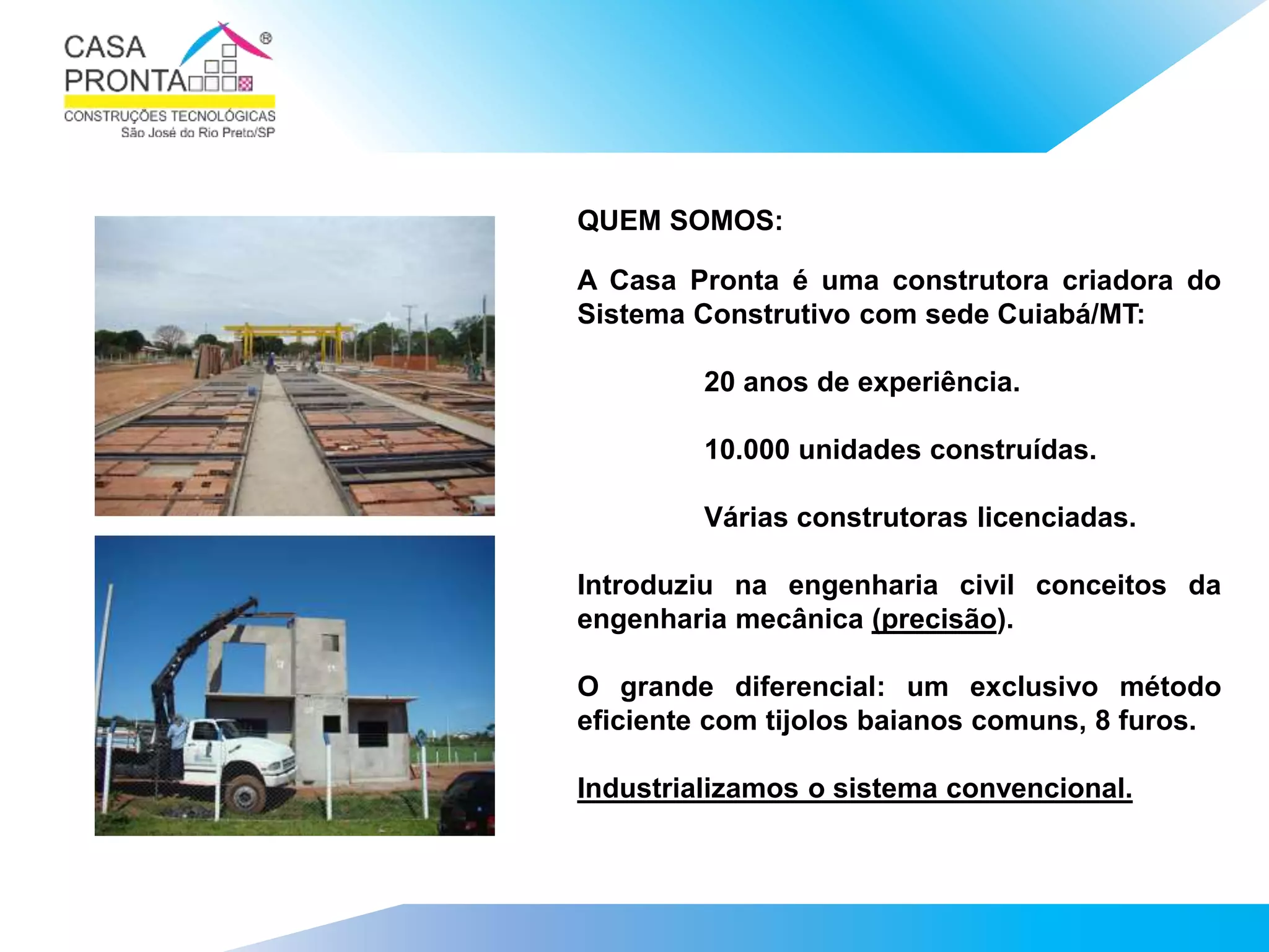 A Casa Pronta é uma construtora com 20 anos de experiência e 10.000 unidades construídas, que utiliza um método exclusivo de construção com tijolos baianos para aumentar a eficiência e conforto térmico e acústico. A empresa opera em várias cidades do Brasil e visa resolver o déficit habitacional que pode atingir 30 milhões de moradias até 2050. Com um ritmo de produção de 12 casas por dia, a Casa Pronta se destaca pela industrialização do sistema convencional de construção.