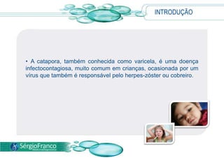 A catapora é uma doença viral contagiosa comum em crianças, causada pelo vírus varicela-zóster. Manifesta-se inicialmente por pequenas bolhas na pele que coçam e evoluem para crostas. É transmitida por contato direto com as lesões ou via aérea. O diagnóstico é clínico e o tratamento foca no alívio dos sintomas. A vacinação é a forma mais eficaz de prevenção.