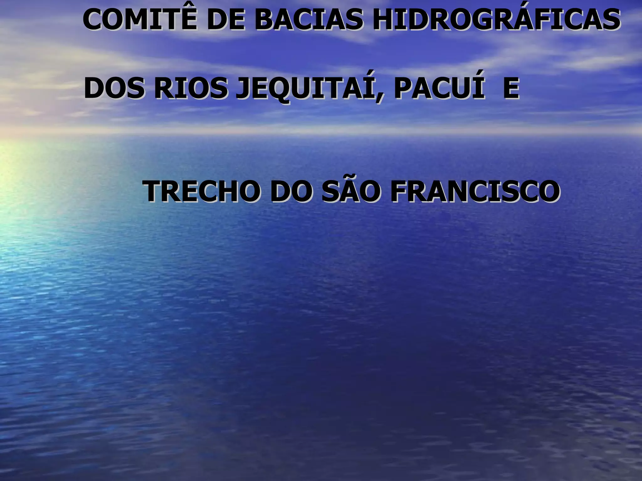 O documento descreve o Comitê de Bacias Hidrográficas dos Rios Jequitaí, Pacuí e trecho do São Francisco, incluindo sua composição, competências e atividades realizadas. Foi aprovado o Plano Diretor de Recursos Hídricos da Bacia dos Rios Jequitaí e Pacuí e trecho do São Francisco pelo Conselho Estadual de Recursos Hídricos, que não definiu o enquadramento das águas mas deu diretrizes gerais. Foram identificados conflitos nas bacias dos ri