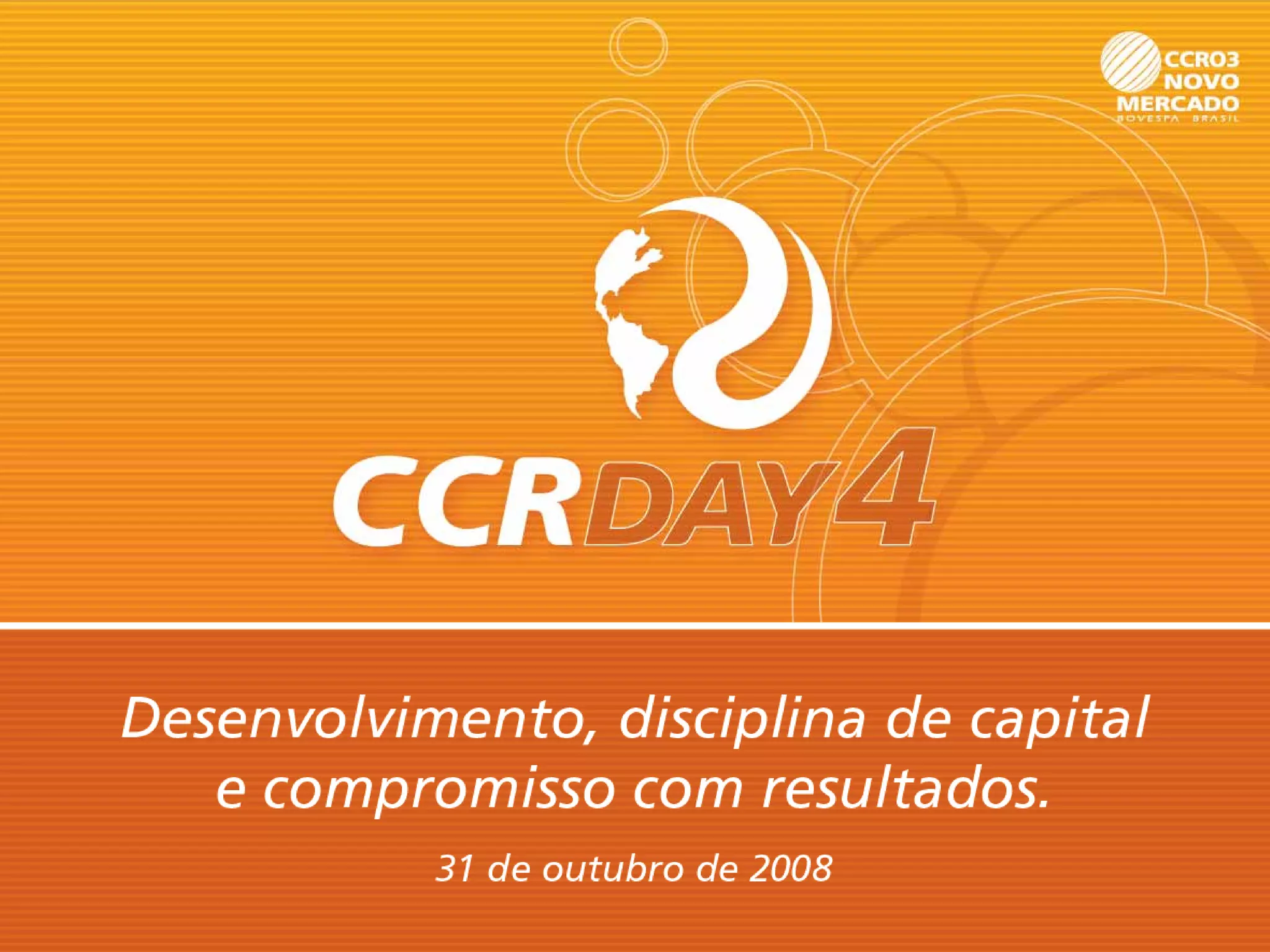 O documento apresenta os resultados financeiros da CCR no 3T08, destacando crescimento da receita líquida e lucro líquido. Apresenta também o portfólio da empresa, perspectivas positivas e cronograma de investimentos até 2009, focado principalmente em AutoBAn, NovaDutra e ViaQuatro.