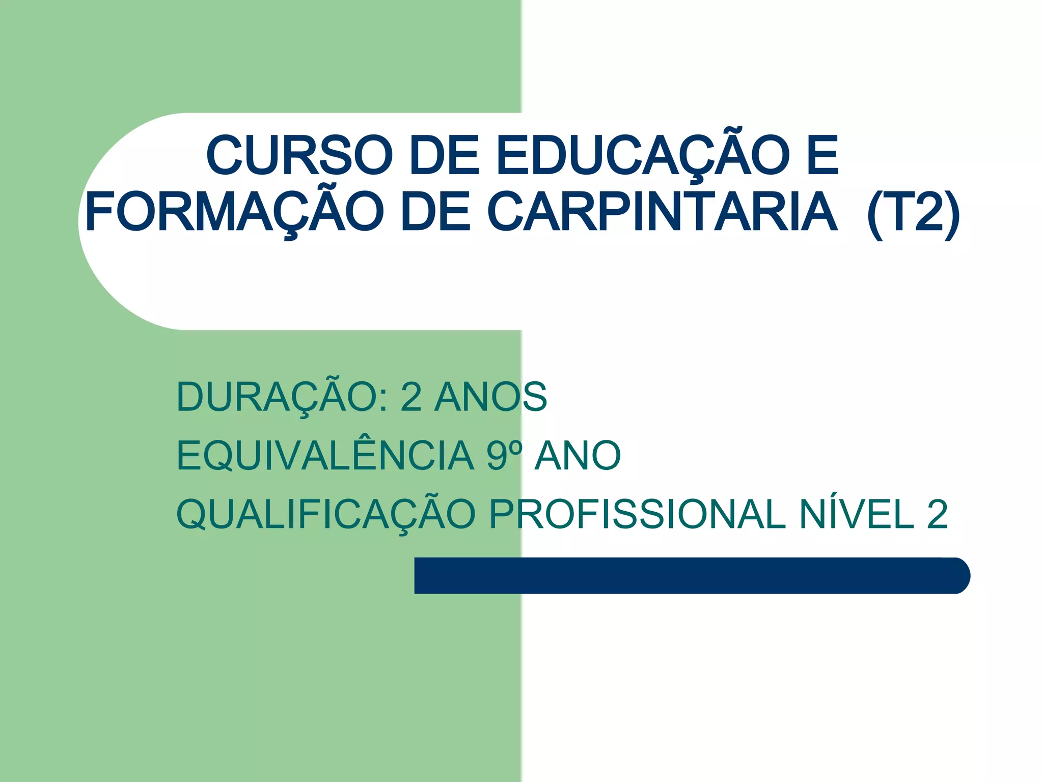 Este documento descreve um curso de formação profissional de carpintaria com duração de 2 anos. O curso inclui disciplinas sócio-culturais, científicas e tecnológicas ministradas por vários professores. O curso destina-se a jovens a partir dos 15 anos que não completaram o ensino básico ou secundário e visa proporcionar qualificações profissionais.
