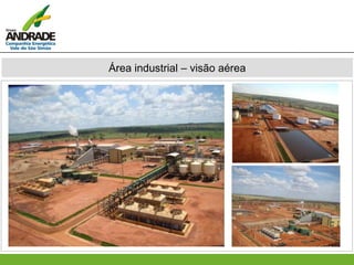 A apresentação descreve as instalações e equipamentos de uma usina de cana-de-açúcar localizada em Santa Vitória - MG, incluindo áreas industriais, moenda, caldeira, geração de energia, tratamento de caldo, destilação, produção de açúcar e álcool, e tratamento de resíduos.