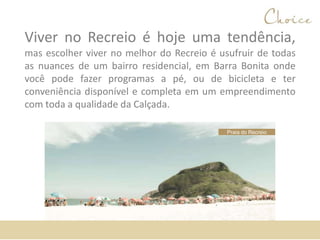 O documento descreve um empreendimento imobiliário localizado no bairro do Recreio dos Bandeirantes no Rio de Janeiro. O empreendimento oferece 360 unidades residenciais de 3 quartos com suíte, além de diversas áreas de lazer e comodidades. O condomínio possui acesso a praias e áreas verdes, além de estar próximo a shoppings e transporte público.