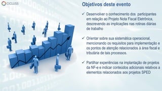 [1] O documento apresenta um curso sobre a Nota Fiscal Eletrônica (NF-e) com o objetivo de desenvolver o conhecimento sobre o projeto e orientar sobre sua sistemática operacional e requisitos de implementação; [2] A NF-e é um documento fiscal digital que substitui a nota fiscal de papel e é obrigatório para empresas de todos os portes e segmentos; [3] O processo de emissão envolve a autorização, processamento, emissão do documento auxiliar DANFE e registro na base da receita federal.