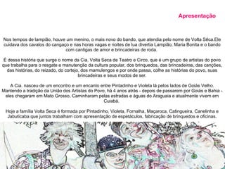 A Cia. Volta Seca de Teatro e Circo é um grupo de artistas populares de Mato Grosso que trabalha para preservar a cultura popular brasileira através de espetáculos, oficinas e fabricação de brinquedos populares. Seu principal espetáculo, "O circo mambembe das ruas do coração de um palhaço", mistura linguagem circense e folclórica e apresenta números musicais, teatro de mamulengos e performances de palhaços.