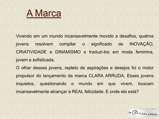 A Clara Arruda é uma marca de moda feminina fundada por quatro jovens empreendedores para traduzir inovação, criatividade e dinamismo em roupas jovens e sofisticadas. A marca tem como público-alvo mulheres de 18 a 35 anos e busca valorizar a simplicidade, família e amizade em sua identidade e produtos. A empresa possui uma fábrica de 600m2 e atua em 15 estados brasileiros.
