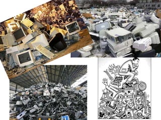 O documento discute os malefícios da tecnologia, incluindo a poluição tecnológica e o lixo eletrônico tóxico, a perda de empregos para máquinas, e problemas de saúde como LER, estresse, problemas de visão causados pelo uso excessivo de computadores.