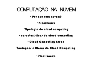 O documento discute a computação em nuvem, definindo-a como o acesso remoto a programas, serviços e arquivos sem a necessidade de instalação local. Apresenta os precursores Joseph Carl Robnett Licklider e John McCarthy e as tipologias de cloud computing como IaaS, PaaS, SaaS e outras. Também discute as características, vantagens, riscos e a computação em nuvem verde.