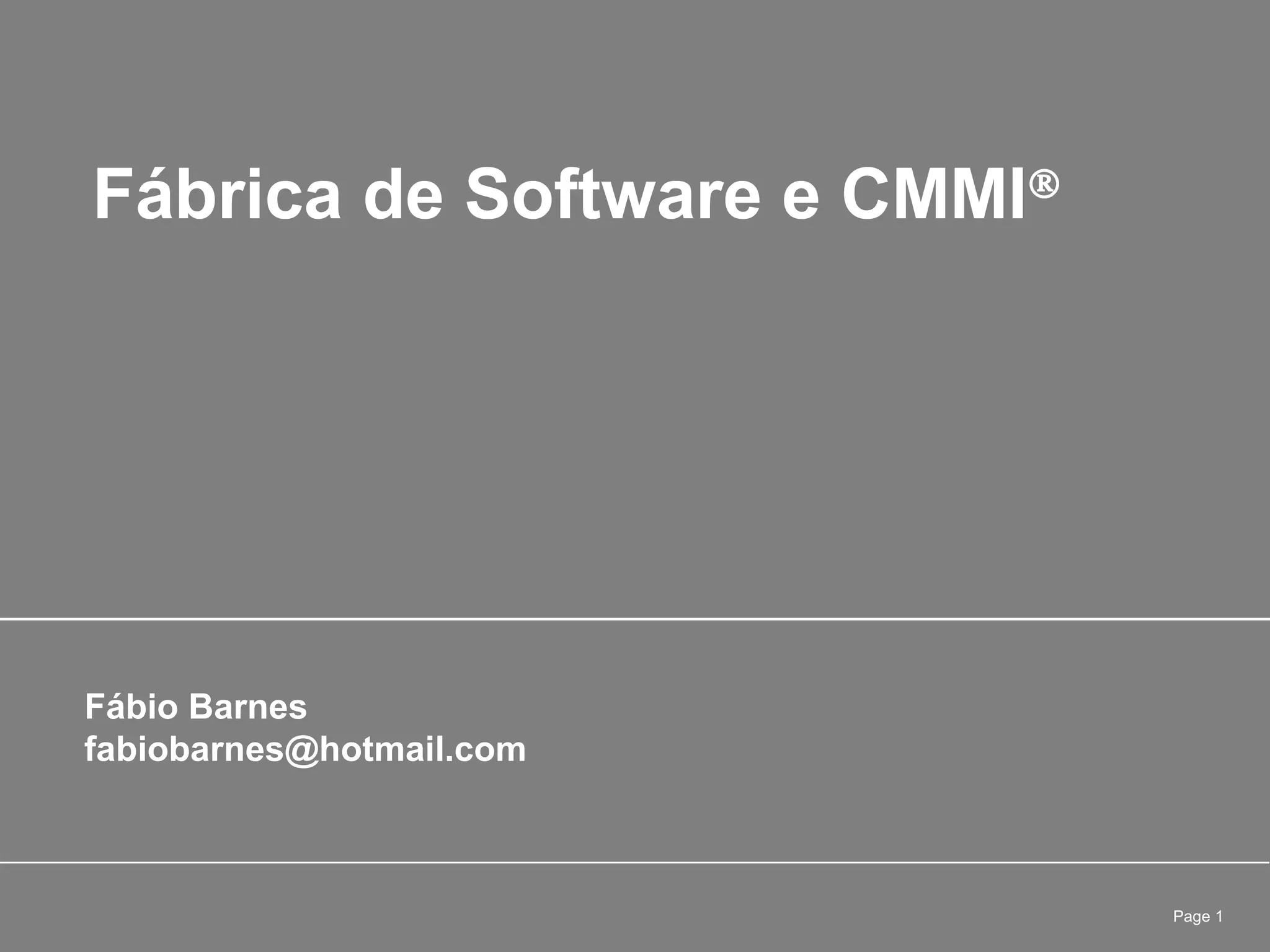 O documento descreve a jornada de uma fábrica de software em alcançar o nível 3 da maturidade de processo segundo o modelo CMMI®. Inicialmente, a fábrica sofria com problemas comuns como atrasos, surpresas de última hora e baixa qualidade. Ao adotar o CMMI®, a fábrica realizou avaliações periódicas que mostraram melhorias contínuas nos processos até alcançar o nível 3 de maturidade, resolvendo os problemas iniciais.