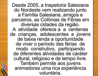 Este documento descreve o subsídio preparado pela Pastoral Juvenil da Inspetoria Salesiana do Nordeste para orientar as Colônias de Férias de 2011. O subsídio fornece informações sobre 10 encontros com jovens voltados para os Direitos Humanos, abordando temas como liberdade, igualdade, saúde e educação. Cada encontro inclui citações bíblicas, de Dom Bosco e uma estrutura sugerida com acolhida, teatro, reflexão, oração e atividades.